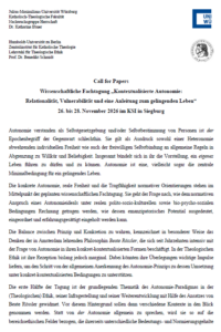 Am 24. und 25. September 2026 findet an der Universität Passau die XIII. Tagung für Praktische Philosophie statt. Judith Simon (Hamburg) und Christof Rapp (München) werden die Plenarvorträge halten – die weiteren Beiträge werden noch gesucht. Das Vorbereitungsteam lädt daher alle Interessierten, mit und ohne universitäre Anbindung, ein, Vorschläge für Vorträge, thematische Panels oder Runde Tische einzureichen. Dabei sind Vorträge aus dem gesamten Spektrum der praktischen Philosophie (angewandte Philosophie, Sozialphilosophie, Ethik, Rechtsphilosophie, politische Philosophie und Theorie, Handlungstheorie, sowohl in analytisch-systematischer wie auch in historischer Tradition) und verwandter Disziplinen willkommen.