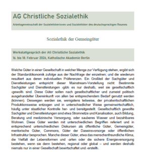 Von 16. bis 18. Februar 2026 wird in der Katholischen Akademie Berlin das Berliner Werkstattgespräch 2026 stattfinden. Die jährliche Tagung der AG Christliche Sozialethik widmet sich dieses Mal dem Thema „Sozialethik der Gemeingüter“.