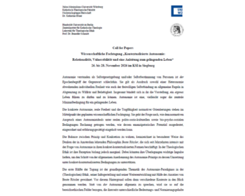 Von 26. bis 28. November 2026 findet im KSI in Siegburg die wissenschaftliche Fachtagung „Kontextualisierte Autonomie: Relationalität, Vulnerabilität und eine Anleitung zum gelingenden Leben“ statt. Im Rahmen der von Katharina Ebner und Benedikt Schmidt organisierten Tagung sind zwei freie Beiträge mit einer Vortragsdauer von max. 20 Minuten vorgesehen, die sich im Themenfeld der Tagung verorten sollen. Das Organisationsteam lädt herzlich zur Einreichung von Themenvorschlägen und möglichen Beiträgen aus der Theologischen Ethik und benachbarten Disziplinen ein. Angesprochen sind ausdrücklich Nachwuchswissenschaftler*innen. Inhaltlich sollen die Beiträge an die Thematik der Fachtagung anschlussfähig sein. Zu denken wäre etwa an eine Auseinandersetzung mit der nichtmenschlichen Umwelt, der Bedeutung von Autonomie im politischen Feld unter den Bedingungen von Digitalisierung oder auch Autonomiekonzeptionen nichtwestlicher Denktraditionen. Einreichungen von Abstracts sind bis 31. Mai 2026 möglich. Für die beiden eingeladenen Personen werden Fahrt-, Unterbringungs- und Verpflegungskosten übernommen. Zudem ist eine Publikation der Beiträge im Tagungsband vorgesehen. Zum Call for Papers inkl. ausführlicher Informationen zu den Tagungsinhalten.